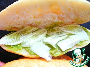 Собираем Бань ми: смазываем авокадо соусом. Сверху кладем пластинки огурца.