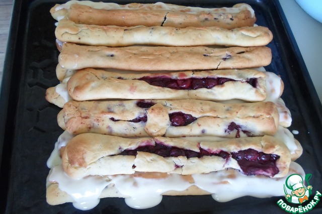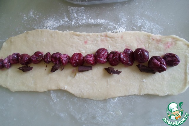 На каждую полоску выкладываем вишню или другую начинку по вашему вкусу (шоколад, сухофрукты, кусочки фруктов, джем), главное, чтобы начинка не растекалась и сочеталась со сметанным кремом. -