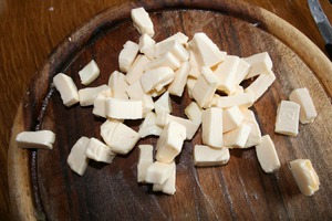 Плавленный сырок порезать мелкими кубиками, выложить в суп.