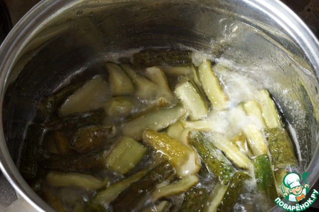Через три часа огурцы дали сок, сахар растворился, ставим на средний огонь, доводим до кипения и варим минут 20, за это время огурцы поменяют цвет.