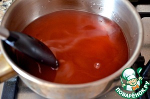 Положить листы желатина в миску с холодной водой и оставить размокать 1-2 минуты. Влить в кастрюльку половину вина и всыпать сахар, разогревать на среднем огне до полного растворения сахара. Желатин достать из воды рукой, чуть отжать лишнюю жидкость и положить в кастрюлю с вином. Вино должно быть горячим, но не кипящим, потому что в кипящем желатин не сработает и желе не возьмется, а в холодном желатин не растворится. Когда желатин полностью растворится, влейте оставшееся вино и сок лайма. (Если вы используете гранулированный желатин, вам потребуется один пакетик, 11 грамм. Просто всыпьте желатин в вино вместе с сахаром и разогревайте до полного растворения желатина и сахара.) Дайте вину остыть.