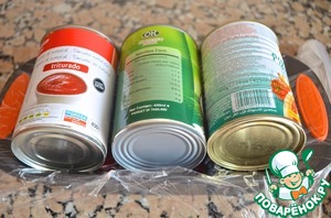 Закрыть пищевой пленкой и положить сверху несколько консервных банок. Это делается для того, чтобы желе было более плотным, и чтобы его было легче резать. Убрать террин в холодильник на 2 часа. Затем разогреть оставшиеся 150 мл вина и вылить на поверхность террина. Опять закрыть пленкой и убрать в холодильник на ночь.