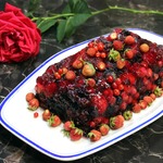 Выложить самые красивые ягодки на дно формы для террина вместительностью 1 литр. В готовом десерте ягоды, которые мы кладем на дно террина, оказываются сверху, поэтому стоит потратить время и красиво их разложить. Всыпать остальные ягоды и залить 350 мл вина.