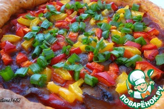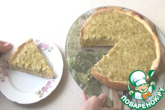 • Через 20 минут достаем пирог из духовки и укладываем слои: зеленый лук