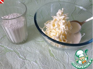 Замороженное сливочное масло натираем на крупной терке, добавляем остальные ингредиенты - замешиваем тесто и убираем его на 20 минут в холодильник.