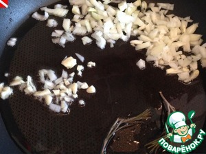 На разогретой сковороде обжариваем мелко нарезанный лук, 1 зубчик чеснока и веточку розмарина.