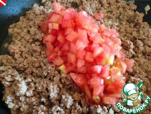 Когда фарш изменит свой цвет и даст сок, добавляем помидор. Готовим, помешивая, до испарения жидкости - минут 10-15,