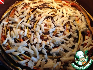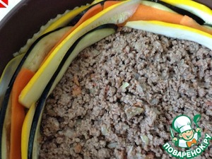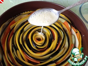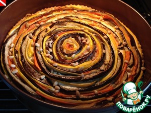 И начинаем выкладывать "спираль" из овощей. Я начала от бортиков - сначала круг кабачков (кожицей вверх), затем баклажаны и морковь.