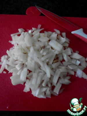 Пока наш перчик печется, нарезаем лук очень меленько и жарим на сковороде до золотистого цвета