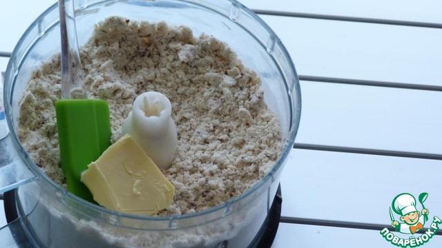 Фундук с мукой измельчить. Если фундук не превратился в муку, не страшно. На мой взгляд, это даже плюс. Когда попадаются небольшие кусочки орехов в пироге – это очень вкусно. Добавить сливочное масло. Его лучше нарезать на небольшие кусочки. Еще раз все порубить в комбайне. Тесто должно стать похоже на хлебные крошки. Добавить сахар и перемешать.