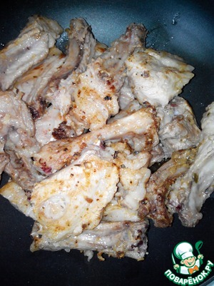 • Ребра моем, режем на кусочки и заливаем всеми продуктами для маринада, оставляем на час
