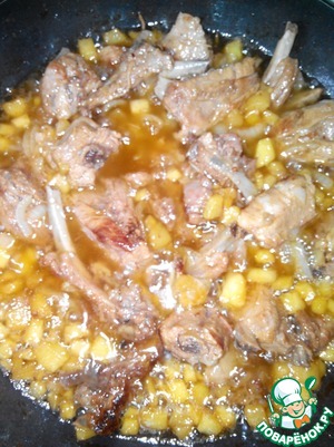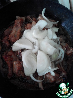 • И добавляем к нашим ребрам с обжаренным лучком, перемешиваем, добавляем пол стакана воды, накрываем крышкой и тушим минут 8-10
