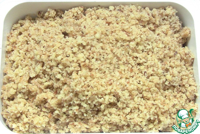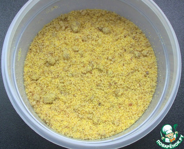 Перемешать кукурузную муку с разрыхлителем и измельченными орехами.