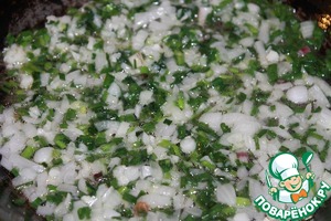 Репчатый лук мелко нарежьте. Обжарьте чеснок на масле до мягкости с двумя видами луками