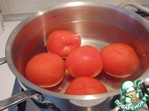 Помидоры надрезать крестом и опустить в кипящую воду на 2 минуты, переложить в посуду с холодной водой. Достать, очистить от кожицы.