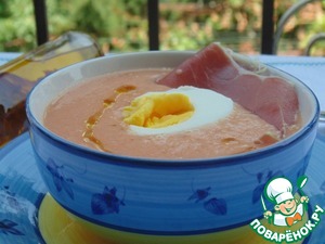 Подавать холодным, украсить ломтиком Хамона и кусочками вареного яйца, сбрызнуть оливковым маслом.