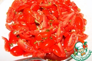 Нарезать помидоры черри на 4 части, добавить мелко нарезанный чеснок, базилик, тимьян и орегано. Посолить, заправить 1,5 ст. л. масла и перемешать.