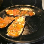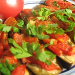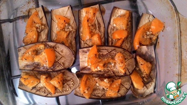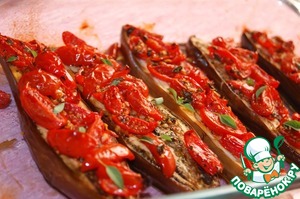 Баклажаны нарезать вдоль толщиной не менее 1 см. и острым ножом сделать глубокие насечки (как клеточки). Поместить в жаростойкую форму, смазанную 1,5 ст. л. масла, и распределить сверху помидоры.