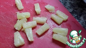 Ананас порезать небольшими кубиками, но если у вас консервированные и порезаные, то их резать уже ненадо, такой размер подойдёт.