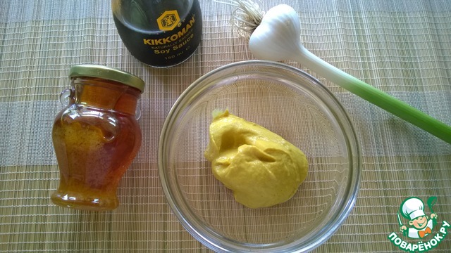 Далее, делаем заправку. Горчицу, мед, соевый соус соединить.