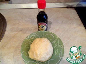 Смешать тесто из сметаны, холодного масла, муки и соевого соуса. Скатать в комочек и убрать в холодильник на 1 час.