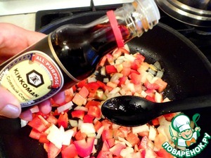 Готовим заправку. Нарезать кубиками 1 луковицу, 1 болгарский перец, 2 помидора, обжарить все на растительном масле до готовности, в конце добавить соль и сахар по вкусу и немного соевого соуса.