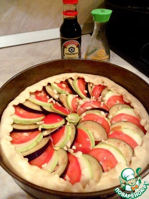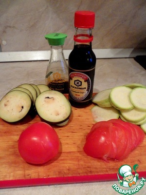 На заправку в виде черепицы выложить кружочки баклажана, кабачка и помидора. Сверху сбрызнуть соевым соусом, 1ст. л. растительного масла и посыпать сухими приправами. Выпекать при температуре 180 градусов 40 минут. Достать из духовки, вынуть из формы, посыпать листочками базилика. Можно есть как в горячем, так и в холодном виде. Получилось очень сочно и вкусно. Очень удобно взять для перекуса на дачу!