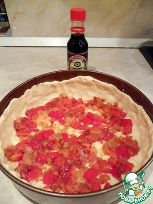 Достать тесто из холодильника и распределить по форме, смазанной маслом, руками тонким слоем. Выложить на тесто нашу заправку.