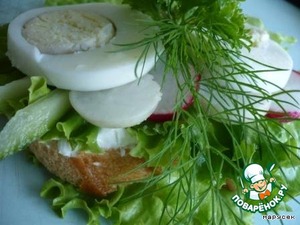 На ломтик хлеба намазываем сыр, сверху укладываем салатные хлопья, кружки яйца и редиса. Украшаем огурцом, петрушкой и укропом. На вкус присаливаем.