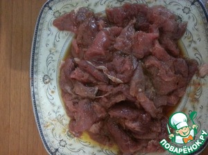 Мясо порезать на тонкие кусочки. добавляем масло, соль, перец и приправы для шашлыка. Мясо ставим в хололильник на час.