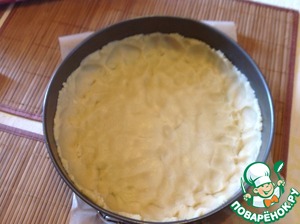 Застелить дно разъемной формы бумагой (я смазала чуть- чуть маслом, неудачная бумага). Тесто распределить по форме. Сделать бортики 2 см. Можно раскатать между листами пекарской бумаги. Я распределила руками.