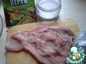 Мясо отбиваем аккуратно в тонкий пласт, солим, перчим. На фото у меня перец белый, но лучше черный свежемолотый.