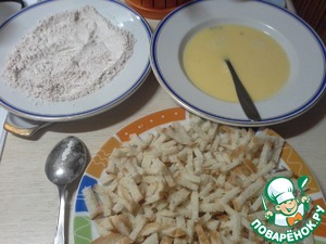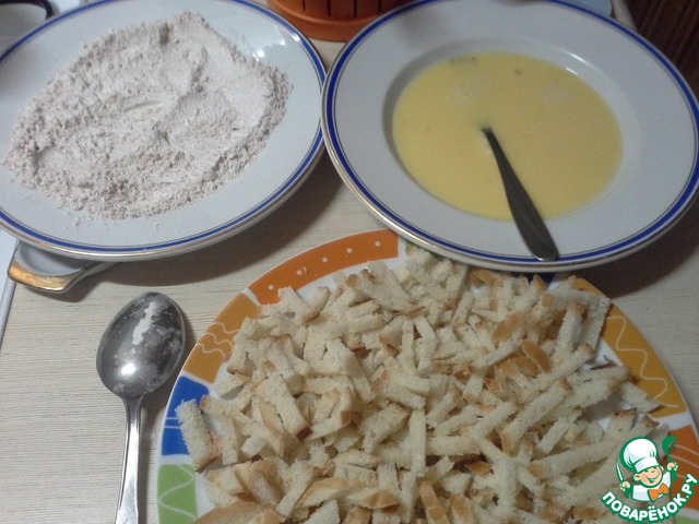 Ставим рядом друг с другом три больших тарелки (одна глубокая): в глубокой тарелке размешиваем вилочкой до однородности яйцо и сливки, на другой смешиваем муку с паприкой, а на третью выкладываем хлеб, нарезанный тонкими брусочками. Чтобы хлеб было удобно тонко нарезать, можно перед этим положить его на 10 минут в морозилку.