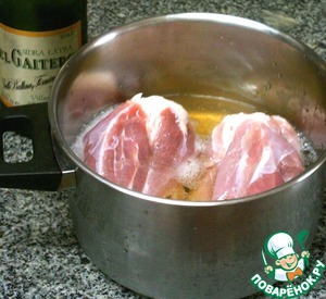Я предварительно сняла с рулек пленки. Кладем рульку в кастрюлю и заливаем сидром. Мне хватило неполной бутылки, когда начнет кипеть, рулька покроется жидкостью. Если же вам не хватит, долейте немного воды.