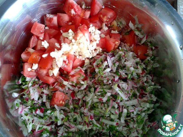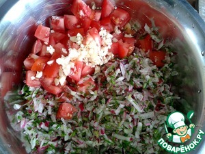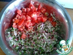 Зелёный лук, укроп, петрушку измельчаем, редис трём на крупной терке, помидоры нарезаем кубиком;