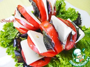 Простая в исполнении, легкая закуска для любителей помидоров. Эффектно выглядит на праздничном столе. Можно сказать, что это-вариант всем известной итальянской закуски "Капрезе", только гораздо менее калорийный. На сто грамм- Б 3.5; Ж 4.1; У 4. Ккал 67. Отличный завтрак для летней диеты!