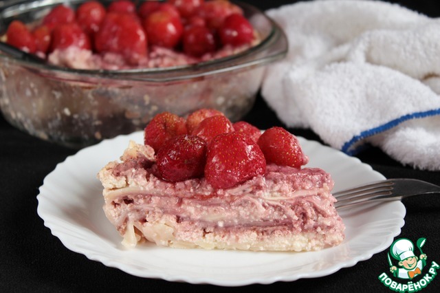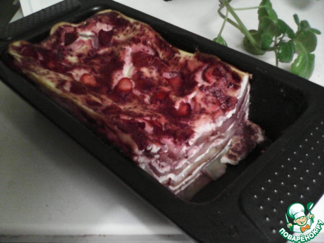 Подготовить листы лазаньи в соответствии с указаниями на упаковке. Для моих листов предварительной обработки не требуется. Смазать форму сливочным маслом. Выкладывать слоями: лазанья, творог, клубничное пюре...