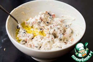 Смешать их с сыром до однородной массы, посолить и поперчить по вкусу. Добавить оливковое масло.