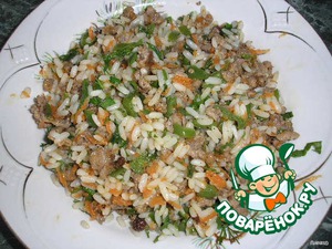 Отварить рис, мелко нарезать петрушку и укроп и добавить в обжаренный фарш. Начинку посолить, поперчить и немного остудить. Затем добавить яйцо и перемешать. Начинка готова.