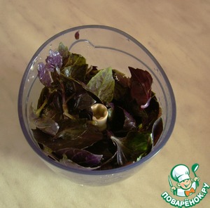 Берем большой пучек базилика и обрываем листочки с веточек. Отправляем их в чашу блендера. Туда же добавляем сок половины лимона.