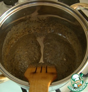 Варим смесь, постоянно помешивая деревянной лопаточкой, чтобы не подгорело. Доводим до состояния сметаны. -