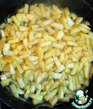 Очистите 2 яблока от кожуры и сердцевины и порежьте на мелкие кусочки. В сотейник насыпьте 3 ст. л коричневого сахара, добавьте 7 ст. л. воды и поставьте на медленный огонь. Растворяем сахар и ждем, пока получится жидкий янтарный сироп. Затем добавьте в него яблоки и проварите их до мягкости. Как только они станут мягкими, взбейте яблочный сироп блендером до однородности.