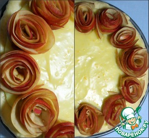 Яблоки нарежьте с помощью овощечистки на небольшие ленты, но не нужно делать их слишком тонкими, они просто засохнут при выпечке. Сформируйте из яблочных лент розы и выложите их на крем по краю формы, слегка вдавливая.