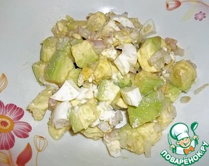 • Яйца отварить, нарезать кубиками. Авокадо очистить и так же нарезать кубиками. Лук мелко нашинковать. Соединить авокадо с яйцами и луком. Заправить 2ст. л. растительного масла, смешанного с 1ст. л. уксуса и щепоткой соли. Оставить пропитаться 10 минут.