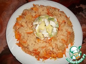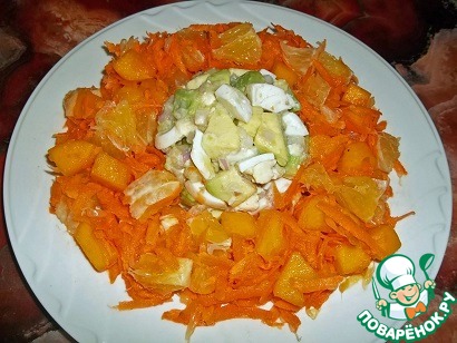 • На середину тарелки выложить горкой авокадо с яйцом, а вкруговую – морковь с фруктами. Зарпавить морковь соусом из растительного масла, сока лимона (или уксуса), сахара и молотого арахиса.