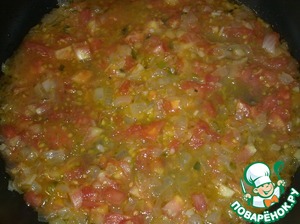 Разогреваем на сковороде сливочное и оливковое масло и обжариваем мелко нарезанный лук, чеснок и черешковый сельдерей. Когда овощи станут мягкими, добавляем мякоть помидор и тушим на медленном огне 10 минут. Солим и перчим по вкусу. Можно добавить нарезанный базилик. Отставляем сковороду для остывания.