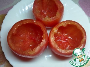Срезаем с помидор шапочку и ложкой аккуратно вычищаем мякоть и семечки. Солим и перчим помидоры внутри.