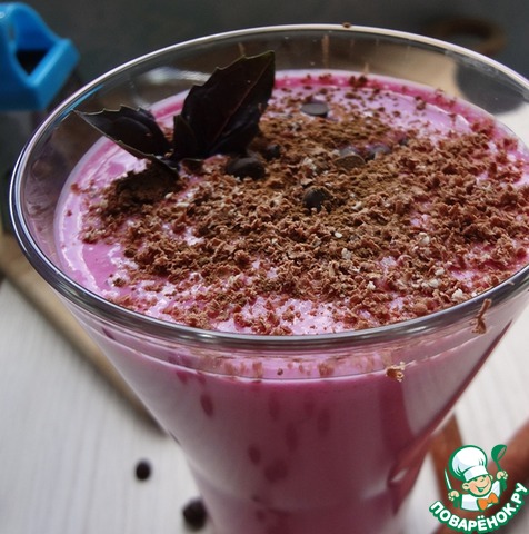 Посыпьте кефир тертым шоколадом и корицей. Насыпьте немного шоколадных капель (они очень вкусно попадаются в кефире!) и украсьте листиком базилика (фиолетовый красивее). Перед употреблением перемешайте.