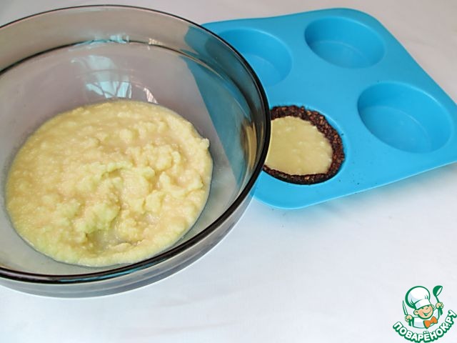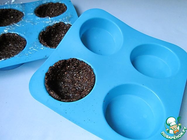 Тщательно вымешиваем "тесто" из какао, орехов и меда. Если смесь рассыпчатая и недостаточно вязкая и пластичная, добавьте несколько капель кипяченой воды. Смесь получается липковатой, но отлично держащей форму. Распределяем массу по силиконовым формочкам, формируя дно и бортики. Я на всякий случай выстлала каждую формочку изнутри пищевой пленкой, но как оказалось, никакой нужды в этом не было, охлажденная в холодильнике в течение нескольких часов смесь отлично отстает от силикона и совершенно к нему не прилипает.