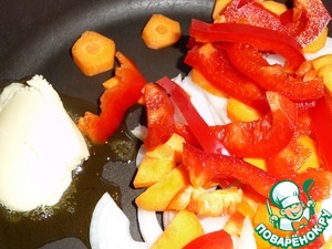 Овощи обжарить на топленом масле до мягкого состояния лука. Соль и перец по вкусу.